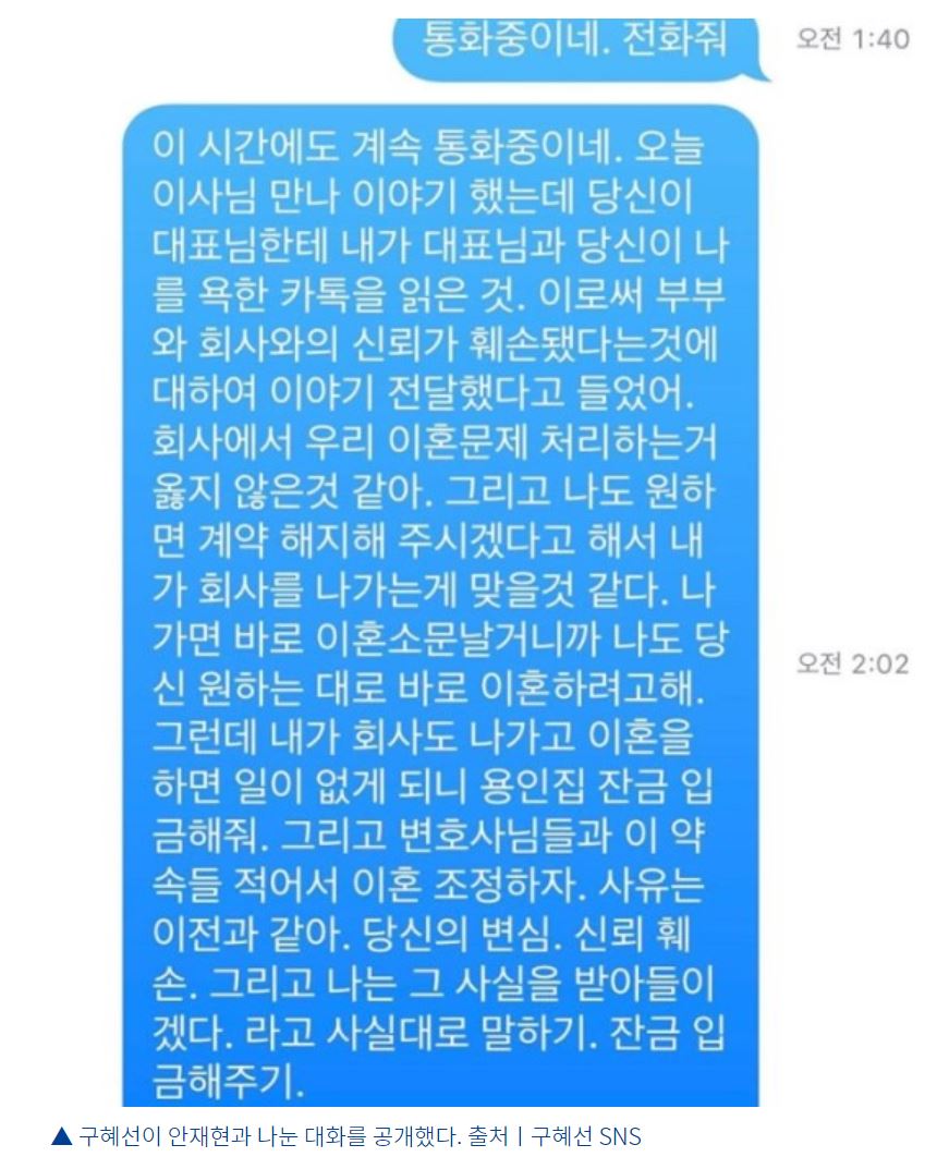 그러면서 구혜선은 안재현과 나눈 메시지도 공개했는데, 해당 메시지에 따르면 안재현은 "이미 그저께 삼일 전 당신이 준 합의서랑 언론에 올릴 글 다음 주에 내겠다고 '신서유기' 측과 이야기 나눈 상황이에요"이라며 "이미 합의된 거고 서류만 남았어요"라고 말했다. 그러면서 "어머니는 내가 통화 안 드린 것도 아니고요"라며 "어머니도 정신없으시겠고 나도 정신없어요. 일은 일대로 진행하고 인사드릴게요"라고 말했다.