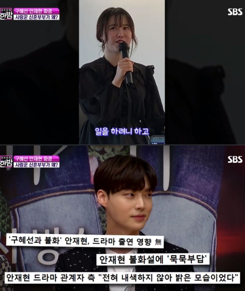 20일 방송된 SBS '본격연예 한밤'에서 한 기자는 "16년에 결혼하고 용인 신혼집에서 잘 지내가다 올 초에 안재현은 드라마 촬영, 구혜선은 다른 활동으로 바빴다. 그 이후로 쭉 따로 지내고 있다"며 두 사람의 위기가 한참 전부터 이어져왔다고 전했다.