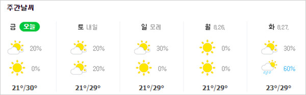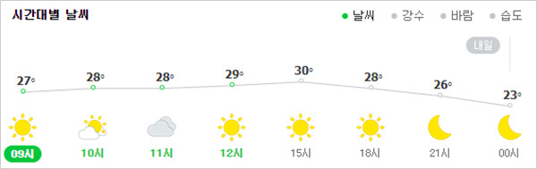 한편 기상청은 이날 대부분 지역의 낮 최고기온이 30도를 넘지 않으면서 더위는 한풀 꺾일 것으로 전망했다. 아침 기온은 18~24도, 낮 기온은 27~31도로 평년과 비슷하다. 내일 최저기온은 17도~22도로 열대야도 한풀 꺾일 전망이다.