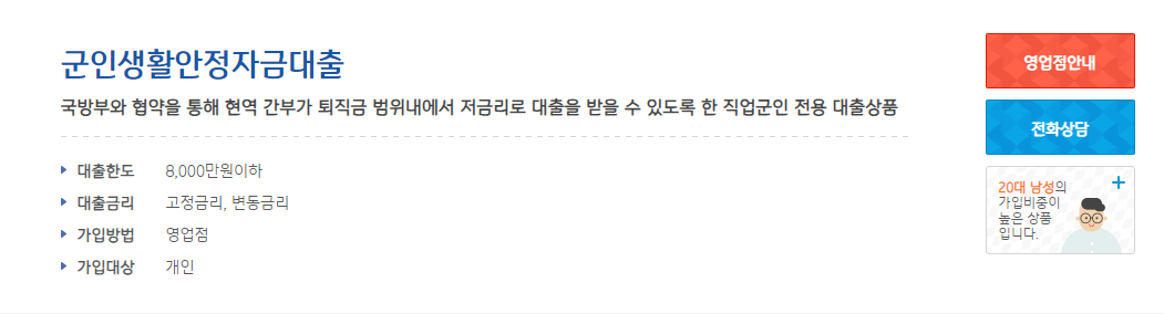 - 대출대상 – 1년 이상 재직자, 급여이체를 하는 중사 계급 이상의 군인