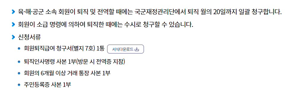 국방부 본부 공무원, 국방부 직할부대 및 산하기관(단체) 소속회원이 퇴직한 때에는 별지 4호 서식에 의한 회원급여 청구서를 작성 소속기관에 제출하고, 소속기관은 이를 종합하여 공제회에 20일까지 청구하여야 합니다.