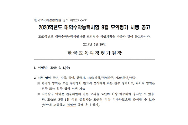수능을 대비한 마지막 평가인 모의고사가 얼마 남지 않았습니다. 2020학년도 모의고사는 오는 4일 시행됩니다. 2019 9월 모의고사는 크게 3가지 정도로 장점이 있습니다. 다른 모의고사에 비해 본인에 대한 객관적인 평가와 진단을 하는데 도움이 될 수 있습니다. 또한 수시 전략을 세우는 마지막 점검 사항으로 활용될 수 있고 수능까지 남은 2개월 동안 학습계획은 수립하는 새로운 기준이 되기도 합니다. 아래는 한국교육과정평가원에서 공고한 2020학년도 대학수학능력시험 9월 모의평가 시행 공고입니다.